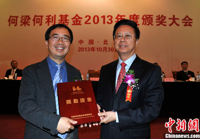 10月30日,香港何梁何利基金在北京举行2013年度颁奖典礼,中国科学院院士、中国科学技术大学教授潘建伟摘得本年度何梁何利最高奖――“科学与技术成就奖”,奖金100万港币。图为中国全国人大常委会副委员长陈昌智(右)向潘建伟院士颁奖。中新社发 孙自法 摄